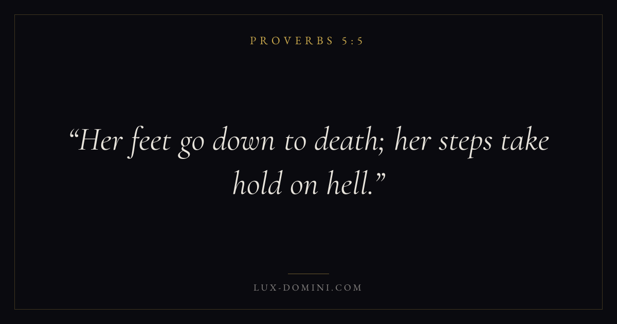Books / Proverbs / Chapter 5 / Verse 5 ← Proverbs 5:4 Proverbs 5:5 Proverbs 5:6 → Her feet go down to death; her steps take hold on hell. Download verse card Share on Twitter Share on Facebook Pin it ✦ Key themes Anxiety and fearWisdomJustice and mercyFear of the Lord Read with Proverbs 5:6Proverbs 5:7Philippians 4:6Isaiah 41:10 Related topics Bible verses about anxiety and fearBible verses about wisdomBible verses about justice and mercy ✦ Proverbs Chapter 5 verses V. 1 V. 2 V. 3 V. 4 V. 5 V. 6 V. 7 V. 8 V. 9 V. 10 V. 11 V. 12 V. 13 V. 14 V. 15 V. 16 V. 17 V. 18 V. 19 V. 20 V. 21 V. 22 V. 23