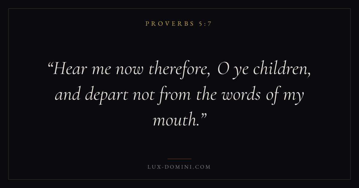 Books / Proverbs / Chapter 5 / Verse 7 ← Proverbs 5:6 Proverbs 5:7 Proverbs 5:8 → Hear me now therefore, O ye children, and depart not from the words of my mouth. Download verse card Share on Twitter Share on Facebook Pin it ✦ Key themes Anxiety and fearWisdomJustice and mercyFear of the Lord Read with Proverbs 5:5Proverbs 5:6Philippians 4:6Isaiah 41:10 Related topics Bible verses about anxiety and fearBible verses about wisdomBible verses about justice and mercy ✦ Proverbs Chapter 5 verses V. 1 V. 2 V. 3 V. 4 V. 5 V. 6 V. 7 V. 8 V. 9 V. 10 V. 11 V. 12 V. 13 V. 14 V. 15 V. 16 V. 17 V. 18 V. 19 V. 20 V. 21 V. 22 V. 23