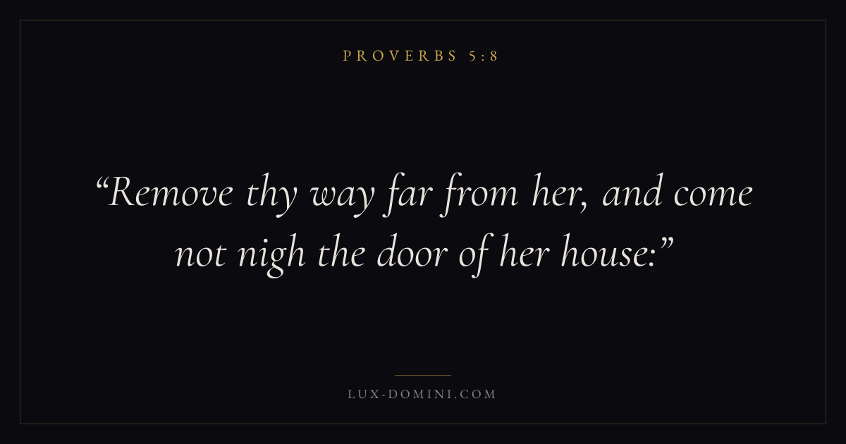 Books / Proverbs / Chapter 5 / Verse 8 ← Proverbs 5:7 Proverbs 5:8 Proverbs 5:9 → Remove thy way far from her, and come not nigh the door of her house: Download verse card Share on Twitter Share on Facebook Pin it ✦ Key themes Anxiety and fearWisdomJustice and mercyFear of the Lord Read with Proverbs 5:9Proverbs 5:10Philippians 4:6Isaiah 41:10 Related topics Bible verses about anxiety and fearBible verses about wisdomBible verses about justice and mercy ✦ Proverbs Chapter 5 verses V. 1 V. 2 V. 3 V. 4 V. 5 V. 6 V. 7 V. 8 V. 9 V. 10 V. 11 V. 12 V. 13 V. 14 V. 15 V. 16 V. 17 V. 18 V. 19 V. 20 V. 21 V. 22 V. 23