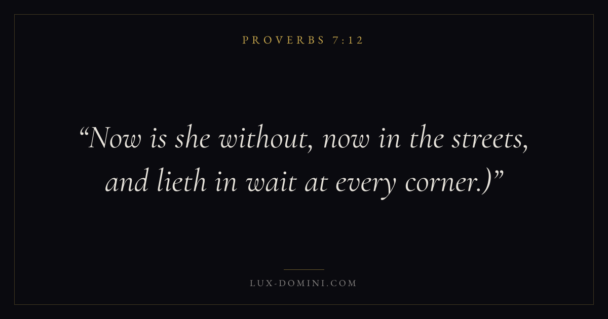 Books / Proverbs / Chapter 7 / Verse 12 ← Proverbs 7:11 Proverbs 7:12 Proverbs 7:13 → Now is she without, now in the streets, and lieth in wait at every corner.) Download verse card Share on Twitter Share on Facebook Pin it ✦ Key themes HopeAnxiety and fearWisdomJustice and mercyFear of the Lord Read with Proverbs 7:11Proverbs 7:13Romans 8:24Revelation 21:4 Related topics Bible verses about hopeBible verses about anxiety and fearBible verses about wisdomBible verses about justice and mercy ✦ Proverbs Chapter 7 verses V. 1 V. 2 V. 3 V. 4 V. 5 V. 6 V. 7 V. 8 V. 9 V. 10 V. 11 V. 12 V. 13 V. 14 V. 15 V. 16 V. 17 V. 18 V. 19 V. 20 V. 21 V. 22 V. 23 V. 24 V. 25 V. 26 V. 27