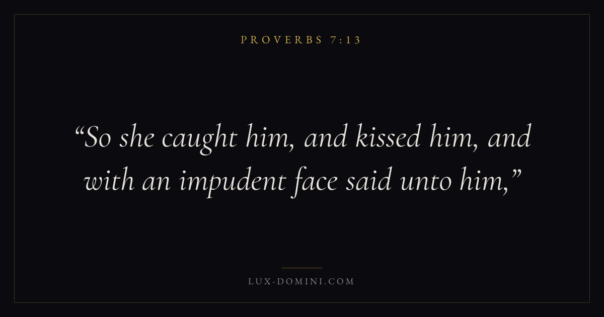 Books / Proverbs / Chapter 7 / Verse 13 ← Proverbs 7:12 Proverbs 7:13 Proverbs 7:14 → So she caught him, and kissed him, and with an impudent face said unto him, Download verse card Share on Twitter Share on Facebook Pin it ✦ Key themes Anxiety and fearWisdomJustice and mercyFear of the Lord Read with Proverbs 7:11Proverbs 7:12Philippians 4:6Isaiah 41:10 Related topics Bible verses about anxiety and fearBible verses about wisdomBible verses about justice and mercy ✦ Proverbs Chapter 7 verses V. 1 V. 2 V. 3 V. 4 V. 5 V. 6 V. 7 V. 8 V. 9 V. 10 V. 11 V. 12 V. 13 V. 14 V. 15 V. 16 V. 17 V. 18 V. 19 V. 20 V. 21 V. 22 V. 23 V. 24 V. 25 V. 26 V. 27