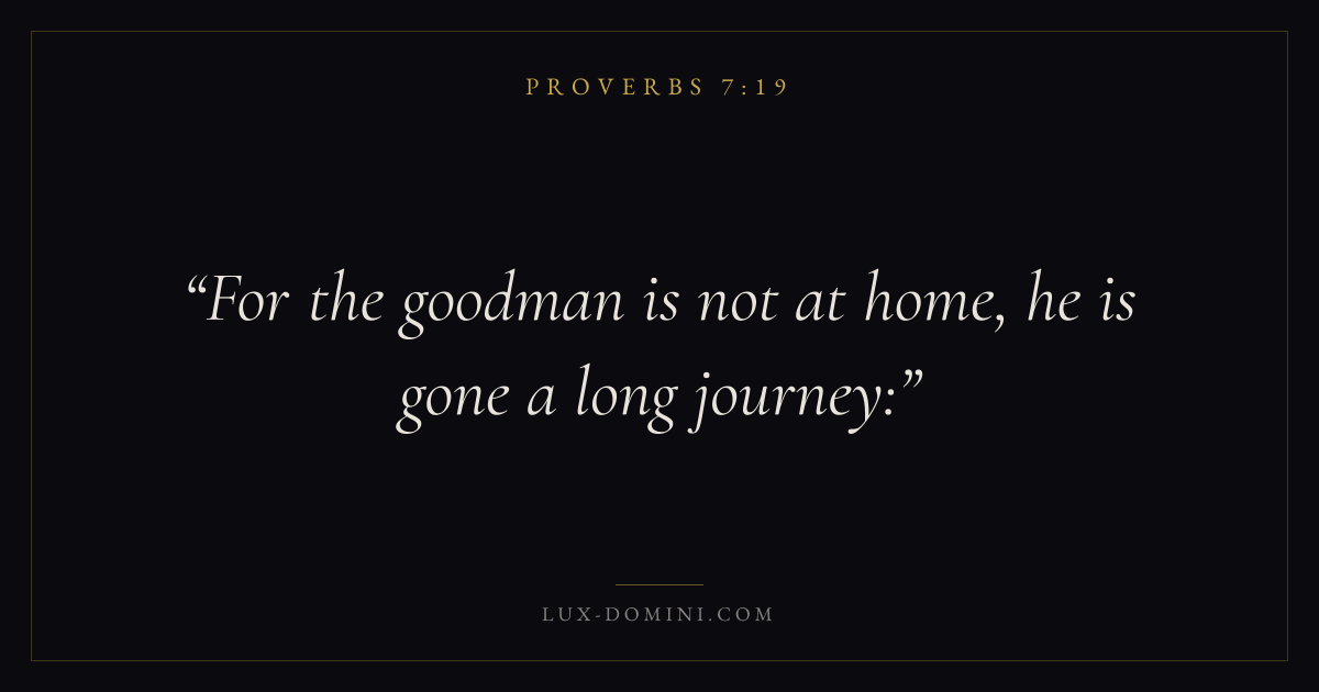 Books / Proverbs / Chapter 7 / Verse 19 ← Proverbs 7:18 Proverbs 7:19 Proverbs 7:20 → For the goodman is not at home, he is gone a long journey: Download verse card Share on Twitter Share on Facebook Pin it ✦ Key themes Anxiety and fearWisdomJustice and mercyFear of the Lord Read with Proverbs 7:18Proverbs 7:20Philippians 4:6Isaiah 41:10 Related topics Bible verses about anxiety and fearBible verses about wisdomBible verses about justice and mercy ✦ Proverbs Chapter 7 verses V. 1 V. 2 V. 3 V. 4 V. 5 V. 6 V. 7 V. 8 V. 9 V. 10 V. 11 V. 12 V. 13 V. 14 V. 15 V. 16 V. 17 V. 18 V. 19 V. 20 V. 21 V. 22 V. 23 V. 24 V. 25 V. 26 V. 27