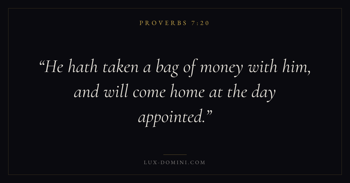 Books / Proverbs / Chapter 7 / Verse 20 ← Proverbs 7:19 Proverbs 7:20 Proverbs 7:21 → He hath taken a bag of money with him, and will come home at the day appointed. Download verse card Share on Twitter Share on Facebook Pin it ✦ Key themes Anxiety and fearWisdomJustice and mercyFear of the Lord Read with Proverbs 7:18Proverbs 7:19Philippians 4:6Isaiah 41:10 Related topics Bible verses about anxiety and fearBible verses about wisdomBible verses about justice and mercy ✦ Proverbs Chapter 7 verses V. 1 V. 2 V. 3 V. 4 V. 5 V. 6 V. 7 V. 8 V. 9 V. 10 V. 11 V. 12 V. 13 V. 14 V. 15 V. 16 V. 17 V. 18 V. 19 V. 20 V. 21 V. 22 V. 23 V. 24 V. 25 V. 26 V. 27