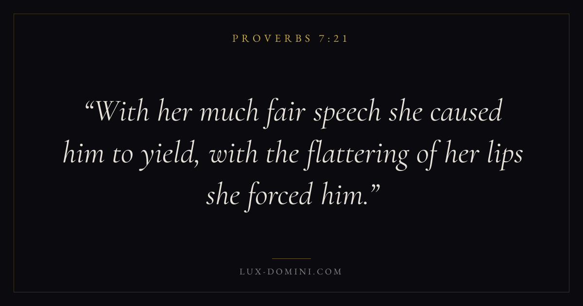 With her much fair speech she caused him to yield, with the flattering of her lips she forced him.