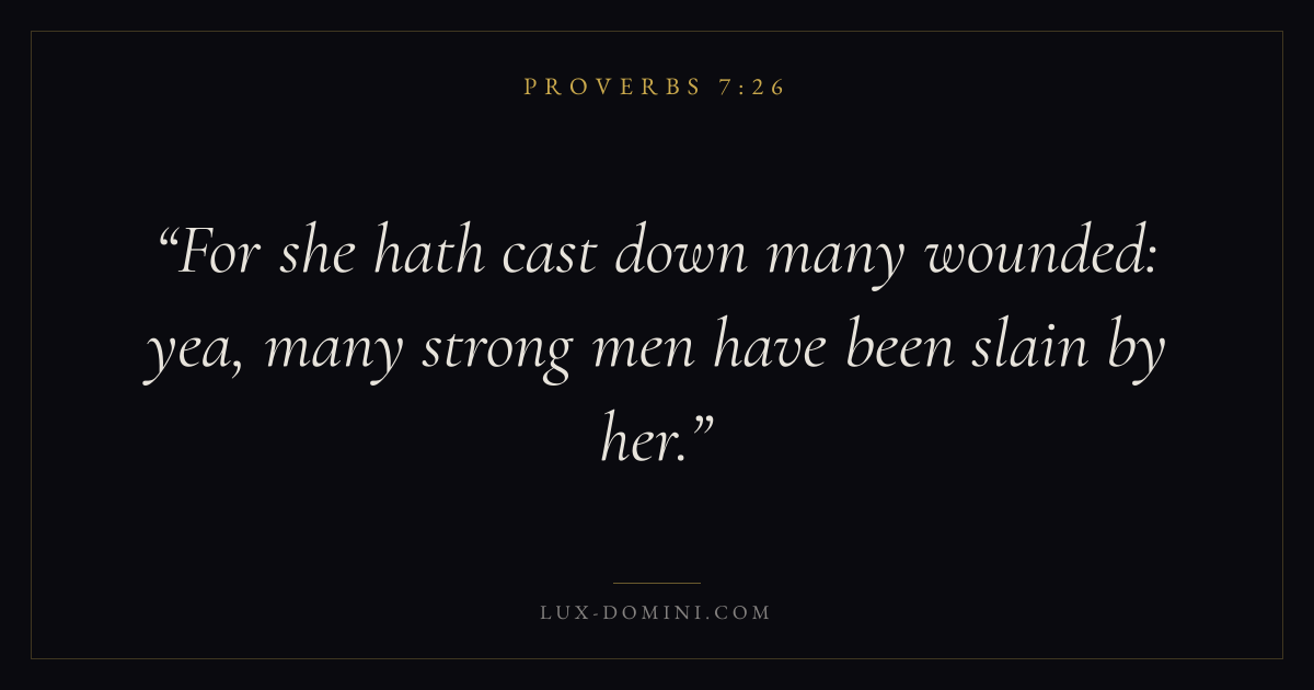 Books / Proverbs / Chapter 7 / Verse 26 ← Proverbs 7:25 Proverbs 7:26 Proverbs 7:27 → For she hath cast down many wounded: yea, many strong men have been slain by her. Download verse card Share on Twitter Share on Facebook Pin it ✦ Key themes Anxiety and fearWisdomJustice and mercyFear of the Lord Read with Proverbs 7:24Proverbs 7:25Philippians 4:6Isaiah 41:10 Related topics Bible verses about anxiety and fearBible verses about wisdomBible verses about justice and mercy ✦ Proverbs Chapter 7 verses V. 1 V. 2 V. 3 V. 4 V. 5 V. 6 V. 7 V. 8 V. 9 V. 10 V. 11 V. 12 V. 13 V. 14 V. 15 V. 16 V. 17 V. 18 V. 19 V. 20 V. 21 V. 22 V. 23 V. 24 V. 25 V. 26 V. 27