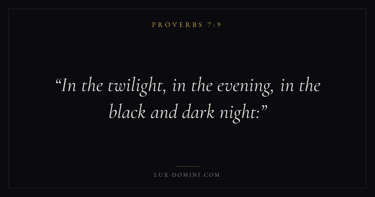 Books / Proverbs / Chapter 7 / Verse 9 ← Proverbs 7:8 Proverbs 7:9 Proverbs 7:10 → In the twilight, in the evening, in the black and dark night: Download verse card Share on Twitter Share on Facebook Pin it ✦ Key themes Anxiety and fearWisdomJustice and mercyFear of the Lord Read with Proverbs 7:6Proverbs 7:7Philippians 4:6Isaiah 41:10 Related topics Bible verses about anxiety and fearBible verses about wisdomBible verses about justice and mercy ✦ Proverbs Chapter 7 verses V. 1 V. 2 V. 3 V. 4 V. 5 V. 6 V. 7 V. 8 V. 9 V. 10 V. 11 V. 12 V. 13 V. 14 V. 15 V. 16 V. 17 V. 18 V. 19 V. 20 V. 21 V. 22 V. 23 V. 24 V. 25 V. 26 V. 27