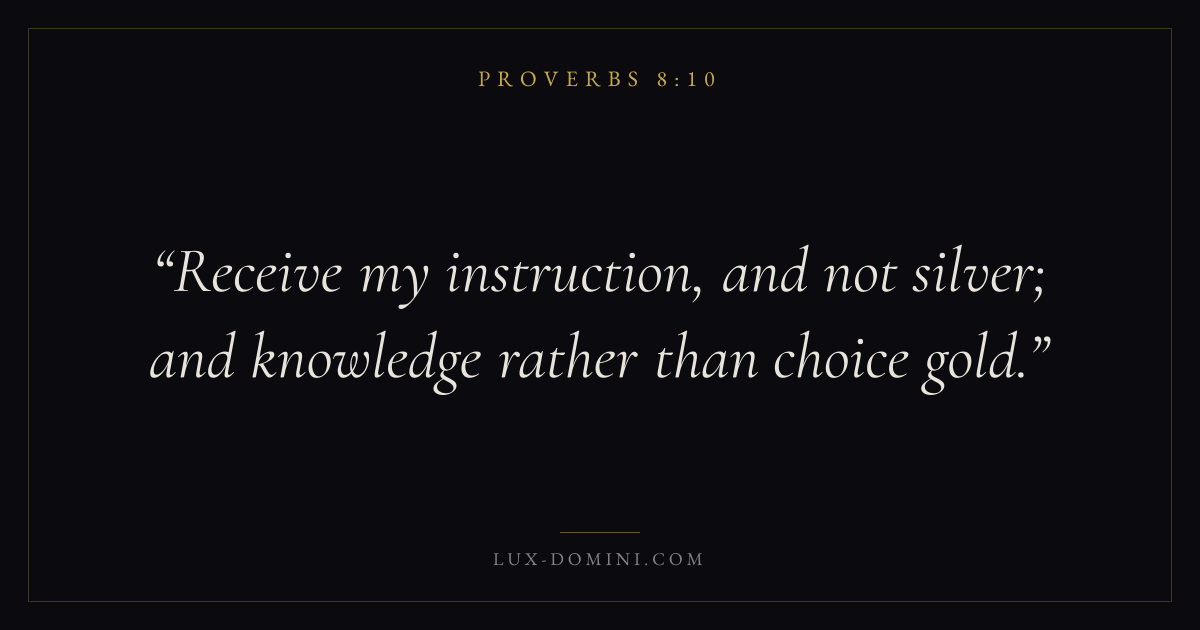 Books / Proverbs / Chapter 8 / Verse 10 ← Proverbs 8:9 Proverbs 8:10 Proverbs 8:11 → Receive my instruction, and not silver; and knowledge rather than choice gold. Download verse card Share on Twitter Share on Facebook Pin it ✦ Key themes Anxiety and fearWisdomJustice and mercyFear of the Lord Read with Proverbs 8:11Philippians 4:6Isaiah 41:10Proverbs 1:7 Related topics Bible verses about anxiety and fearBible verses about wisdomBible verses about justice and mercy ✦ Proverbs Chapter 8 verses V. 1 V. 2 V. 3 V. 4 V. 5 V. 6 V. 7 V. 8 V. 9 V. 10 V. 11 V. 12 V. 13 V. 14 V. 15 V. 16 V. 17 V. 18 V. 19 V. 20 V. 21 V. 22 V. 23 V. 24 V. 25 V. 26 V. 27 V. 28 V. 29 V. 30 V. 31 V. 32 V. 33 V. 34 V. 35 V. 36
