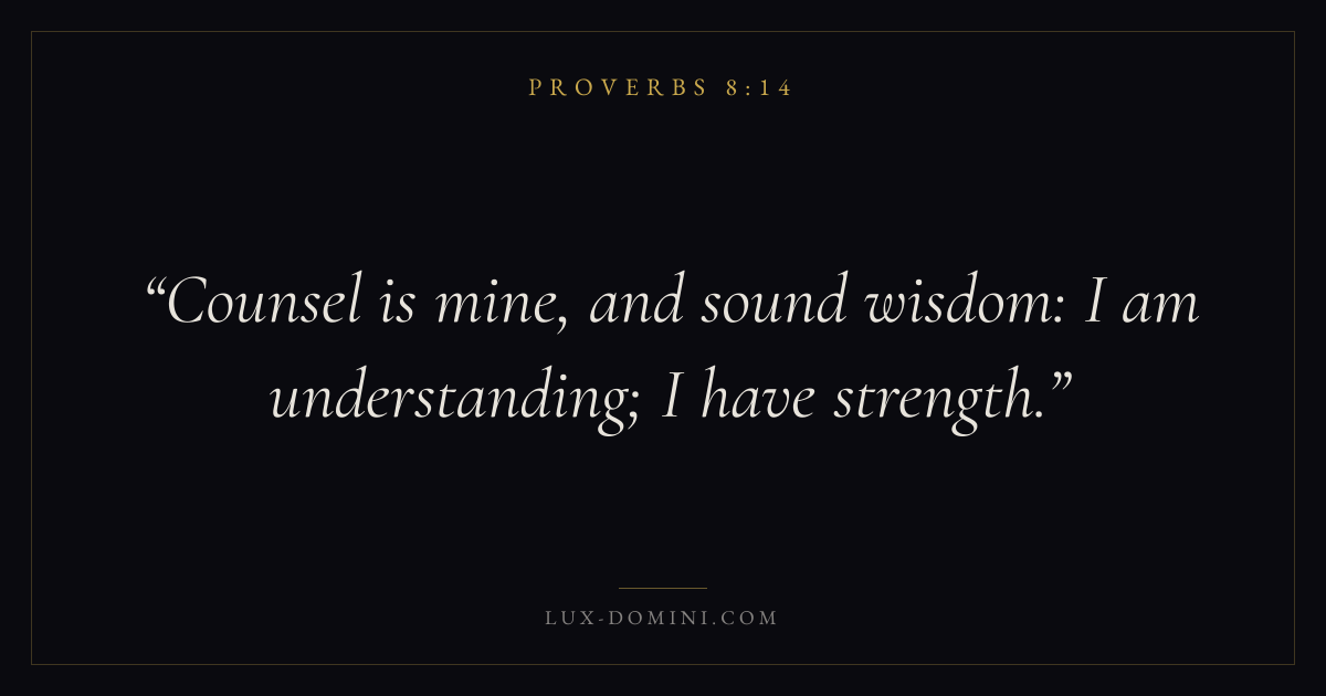 Books / Proverbs / Chapter 8 / Verse 14 ← Proverbs 8:13 Proverbs 8:14 Proverbs 8:15 → Counsel is mine, and sound wisdom: I am understanding; I have strength. Download verse card Share on Twitter Share on Facebook Pin it ✦ Key themes Anxiety and fearWisdomJustice and mercyTruthFear of the Lord Read with Proverbs 8:15Philippians 4:6Isaiah 41:10Proverbs 1:7 Related topics Bible verses about anxiety and fearBible verses about wisdomBible verses about justice and mercyBible verses about truth ✦ Proverbs Chapter 8 verses V. 1 V. 2 V. 3 V. 4 V. 5 V. 6 V. 7 V. 8 V. 9 V. 10 V. 11 V. 12 V. 13 V. 14 V. 15 V. 16 V. 17 V. 18 V. 19 V. 20 V. 21 V. 22 V. 23 V. 24 V. 25 V. 26 V. 27 V. 28 V. 29 V. 30 V. 31 V. 32 V. 33 V. 34 V. 35 V. 36