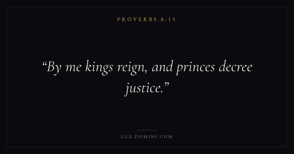 Books / Proverbs / Chapter 8 / Verse 15 ← Proverbs 8:14 Proverbs 8:15 Proverbs 8:16 → By me kings reign, and princes decree justice. Download verse card Share on Twitter Share on Facebook Pin it ✦ Key themes Anxiety and fearWisdomJustice and mercyTruthFear of the Lord Read with Proverbs 8:14Philippians 4:6Isaiah 41:10Proverbs 1:7 Related topics Bible verses about anxiety and fearBible verses about wisdomBible verses about justice and mercyBible verses about truth ✦ Proverbs Chapter 8 verses V. 1 V. 2 V. 3 V. 4 V. 5 V. 6 V. 7 V. 8 V. 9 V. 10 V. 11 V. 12 V. 13 V. 14 V. 15 V. 16 V. 17 V. 18 V. 19 V. 20 V. 21 V. 22 V. 23 V. 24 V. 25 V. 26 V. 27 V. 28 V. 29 V. 30 V. 31 V. 32 V. 33 V. 34 V. 35 V. 36