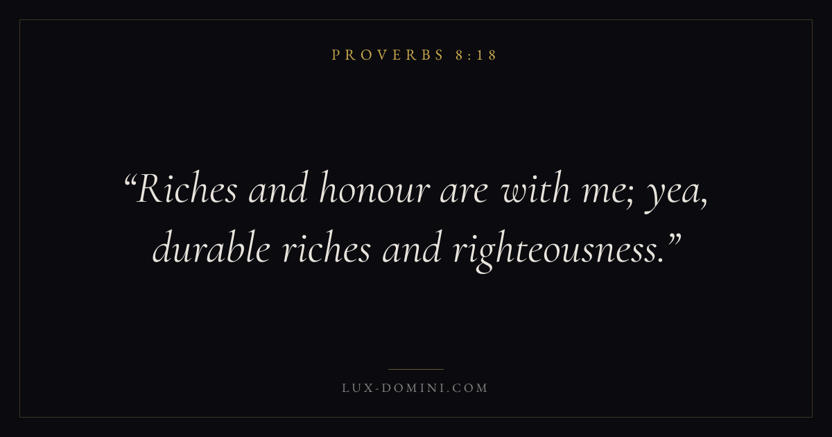 Books / Proverbs / Chapter 8 / Verse 18 ← Proverbs 8:17 Proverbs 8:18 Proverbs 8:19 → Riches and honour are with me; yea, durable riches and righteousness. Download verse card Share on Twitter Share on Facebook Pin it ✦ Key themes Anxiety and fearWisdomJustice and mercyTruthFear of the Lord Read with Proverbs 8:19Philippians 4:6Isaiah 41:10Proverbs 1:7 Related topics Bible verses about anxiety and fearBible verses about wisdomBible verses about justice and mercyBible verses about truth ✦ Proverbs Chapter 8 verses V. 1 V. 2 V. 3 V. 4 V. 5 V. 6 V. 7 V. 8 V. 9 V. 10 V. 11 V. 12 V. 13 V. 14 V. 15 V. 16 V. 17 V. 18 V. 19 V. 20 V. 21 V. 22 V. 23 V. 24 V. 25 V. 26 V. 27 V. 28 V. 29 V. 30 V. 31 V. 32 V. 33 V. 34 V. 35 V. 36