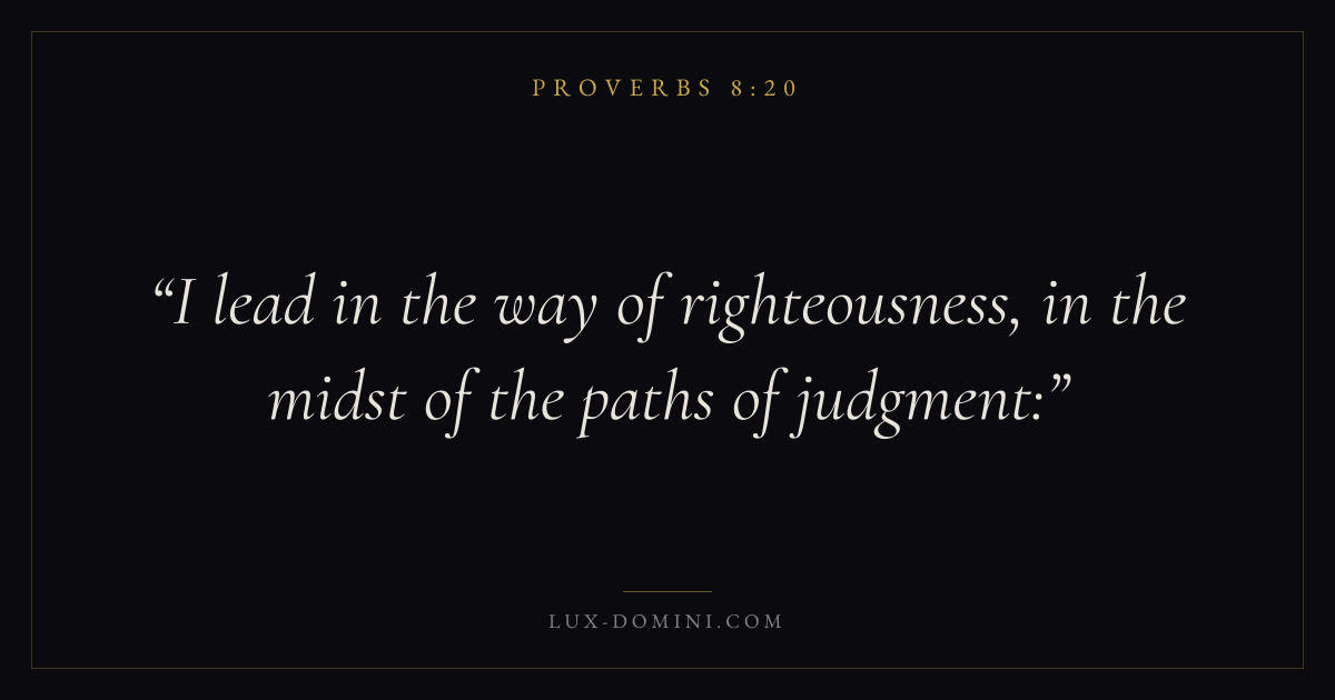 Books / Proverbs / Chapter 8 / Verse 20 ← Proverbs 8:19 Proverbs 8:20 Proverbs 8:21 → I lead in the way of righteousness, in the midst of the paths of judgment: Download verse card Share on Twitter Share on Facebook Pin it ✦ Key themes Anxiety and fearWisdomJustice and mercyTruthFear of the Lord Read with Proverbs 8:21Philippians 4:6Isaiah 41:10Proverbs 1:7 Related topics Bible verses about anxiety and fearBible verses about wisdomBible verses about justice and mercyBible verses about truth ✦ Proverbs Chapter 8 verses V. 1 V. 2 V. 3 V. 4 V. 5 V. 6 V. 7 V. 8 V. 9 V. 10 V. 11 V. 12 V. 13 V. 14 V. 15 V. 16 V. 17 V. 18 V. 19 V. 20 V. 21 V. 22 V. 23 V. 24 V. 25 V. 26 V. 27 V. 28 V. 29 V. 30 V. 31 V. 32 V. 33 V. 34 V. 35 V. 36