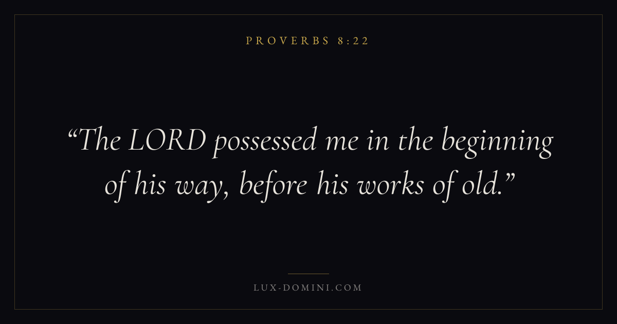 Books / Proverbs / Chapter 8 / Verse 22 ← Proverbs 8:21 Proverbs 8:22 Proverbs 8:23 → The LORD possessed me in the beginning of his way, before his works of old. Download verse card Share on Twitter Share on Facebook Pin it ✦ Key themes Anxiety and fearWisdomJustice and mercyFear of the Lord Read with Proverbs 8:23Proverbs 8:24Philippians 4:6Isaiah 41:10 Related topics Bible verses about anxiety and fearBible verses about wisdomBible verses about justice and mercy ✦ Proverbs Chapter 8 verses V. 1 V. 2 V. 3 V. 4 V. 5 V. 6 V. 7 V. 8 V. 9 V. 10 V. 11 V. 12 V. 13 V. 14 V. 15 V. 16 V. 17 V. 18 V. 19 V. 20 V. 21 V. 22 V. 23 V. 24 V. 25 V. 26 V. 27 V. 28 V. 29 V. 30 V. 31 V. 32 V. 33 V. 34 V. 35 V. 36