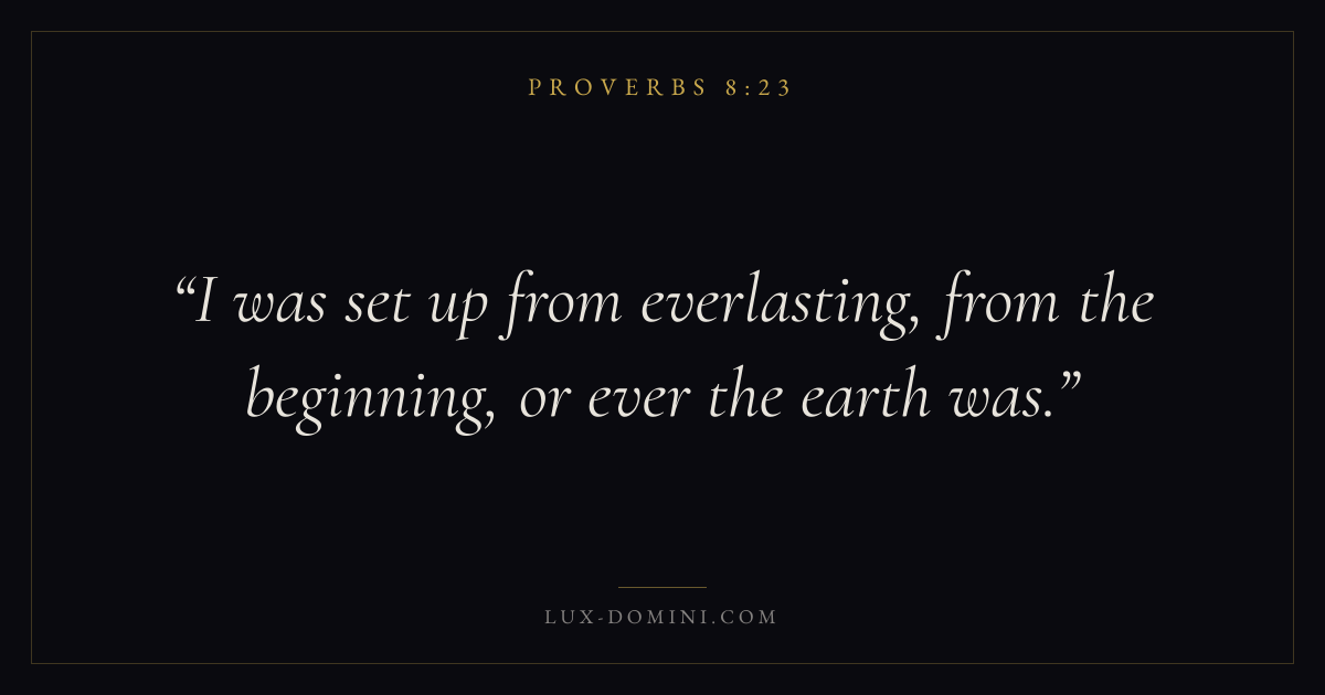 Books / Proverbs / Chapter 8 / Verse 23 ← Proverbs 8:22 Proverbs 8:23 Proverbs 8:24 → I was set up from everlasting, from the beginning, or ever the earth was. Download verse card Share on Twitter Share on Facebook Pin it ✦ Key themes Anxiety and fearWisdomJustice and mercyFear of the Lord Read with Proverbs 8:22Proverbs 8:24Philippians 4:6Isaiah 41:10 Related topics Bible verses about anxiety and fearBible verses about wisdomBible verses about justice and mercy ✦ Proverbs Chapter 8 verses V. 1 V. 2 V. 3 V. 4 V. 5 V. 6 V. 7 V. 8 V. 9 V. 10 V. 11 V. 12 V. 13 V. 14 V. 15 V. 16 V. 17 V. 18 V. 19 V. 20 V. 21 V. 22 V. 23 V. 24 V. 25 V. 26 V. 27 V. 28 V. 29 V. 30 V. 31 V. 32 V. 33 V. 34 V. 35 V. 36