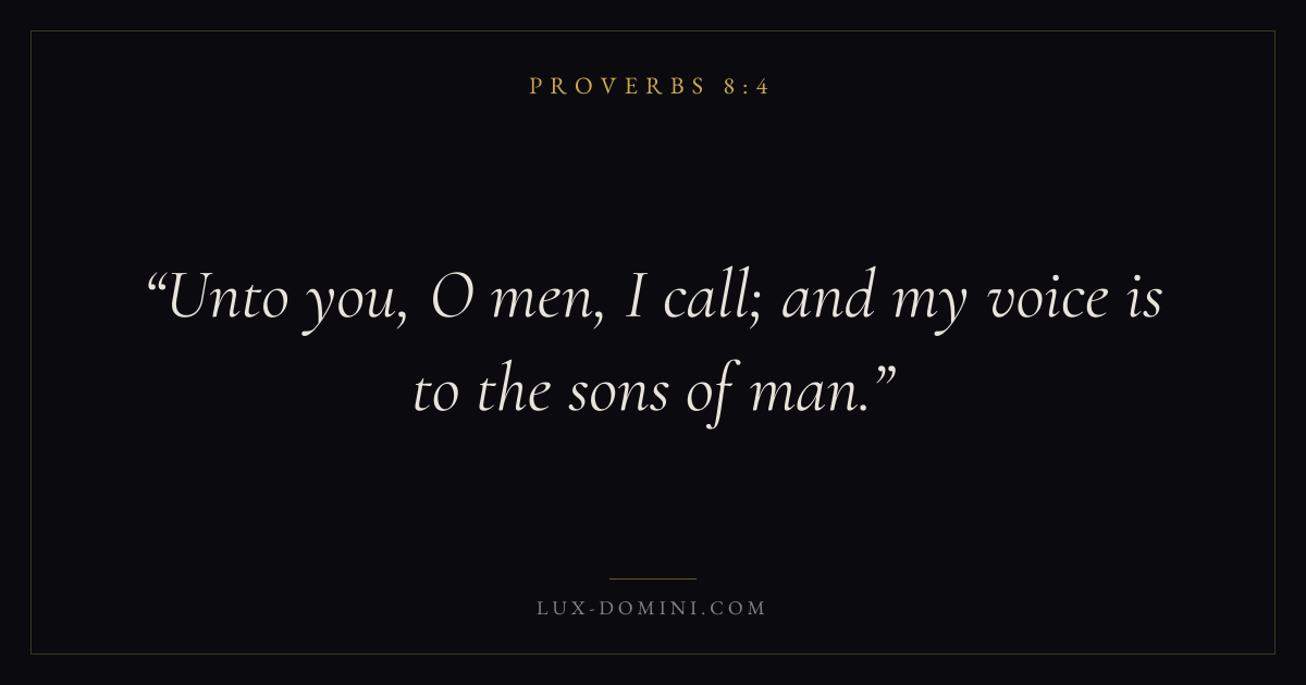 Books / Proverbs / Chapter 8 / Verse 4 ← Proverbs 8:3 Proverbs 8:4 Proverbs 8:5 → Unto you, O men, I call; and my voice is to the sons of man. Download verse card Share on Twitter Share on Facebook Pin it ✦ Key themes Anxiety and fearWisdomJustice and mercyFear of the Lord Read with Proverbs 8:3Proverbs 8:5Philippians 4:6Isaiah 41:10 Related topics Bible verses about anxiety and fearBible verses about wisdomBible verses about justice and mercy ✦ Proverbs Chapter 8 verses V. 1 V. 2 V. 3 V. 4 V. 5 V. 6 V. 7 V. 8 V. 9 V. 10 V. 11 V. 12 V. 13 V. 14 V. 15 V. 16 V. 17 V. 18 V. 19 V. 20 V. 21 V. 22 V. 23 V. 24 V. 25 V. 26 V. 27 V. 28 V. 29 V. 30 V. 31 V. 32 V. 33 V. 34 V. 35 V. 36