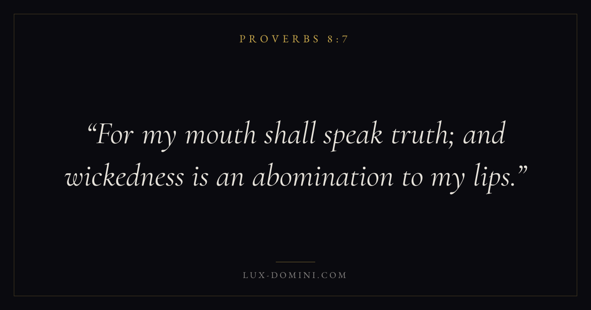 Books / Proverbs / Chapter 8 / Verse 7 ← Proverbs 8:6 Proverbs 8:7 Proverbs 8:8 → For my mouth shall speak truth; and wickedness is an abomination to my lips. Download verse card Share on Twitter Share on Facebook Pin it ✦ Key themes Anxiety and fearWisdomJustice and mercyTruthFear of the Lord Read with Proverbs 8:6Philippians 4:6Isaiah 41:10Proverbs 1:7 Related topics Bible verses about anxiety and fearBible verses about wisdomBible verses about justice and mercyBible verses about truth ✦ Proverbs Chapter 8 verses V. 1 V. 2 V. 3 V. 4 V. 5 V. 6 V. 7 V. 8 V. 9 V. 10 V. 11 V. 12 V. 13 V. 14 V. 15 V. 16 V. 17 V. 18 V. 19 V. 20 V. 21 V. 22 V. 23 V. 24 V. 25 V. 26 V. 27 V. 28 V. 29 V. 30 V. 31 V. 32 V. 33 V. 34 V. 35 V. 36