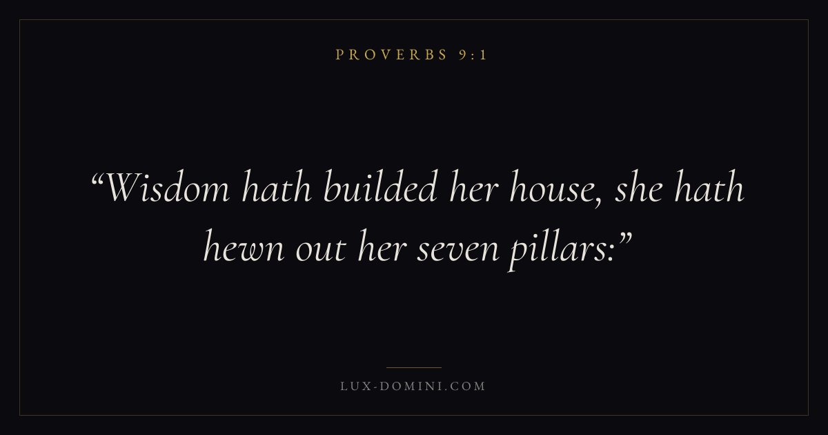 Books / Proverbs / Chapter 9 / Verse 1 ← Proverbs 8:36 Proverbs 9:1 Proverbs 9:2 → Wisdom hath builded her house, she hath hewn out her seven pillars: Download verse card Share on Twitter Share on Facebook Pin it ✦ Key themes FaithAnxiety and fearWisdomJustice and mercyFear of the Lord Read with Proverbs 9:2Hebrews 11:1Romans 10:17Philippians 4:6 Related topics Bible verses about faithBible verses about anxiety and fearBible verses about wisdomBible verses about justice and mercy ✦ Proverbs Chapter 9 verses V. 1 V. 2 V. 3 V. 4 V. 5 V. 6 V. 7 V. 8 V. 9 V. 10 V. 11 V. 12 V. 13 V. 14 V. 15 V. 16 V. 17 V. 18