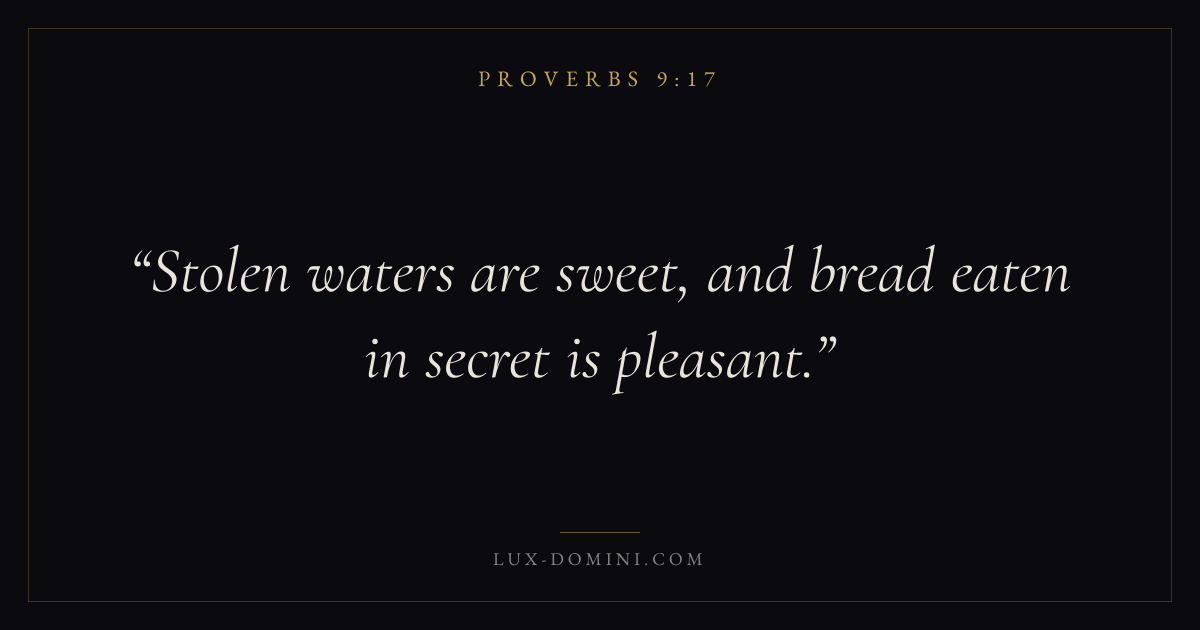 Books / Proverbs / Chapter 9 / Verse 17 ← Proverbs 9:16 Proverbs 9:17 Proverbs 9:18 → Stolen waters are sweet, and bread eaten in secret is pleasant. Download verse card Share on Twitter Share on Facebook Pin it ✦ Key themes Anxiety and fearWisdomJustice and mercyFear of the Lord Read with Proverbs 9:13Proverbs 9:14Philippians 4:6Isaiah 41:10 Related topics Bible verses about anxiety and fearBible verses about wisdomBible verses about justice and mercy ✦ Proverbs Chapter 9 verses V. 1 V. 2 V. 3 V. 4 V. 5 V. 6 V. 7 V. 8 V. 9 V. 10 V. 11 V. 12 V. 13 V. 14 V. 15 V. 16 V. 17 V. 18