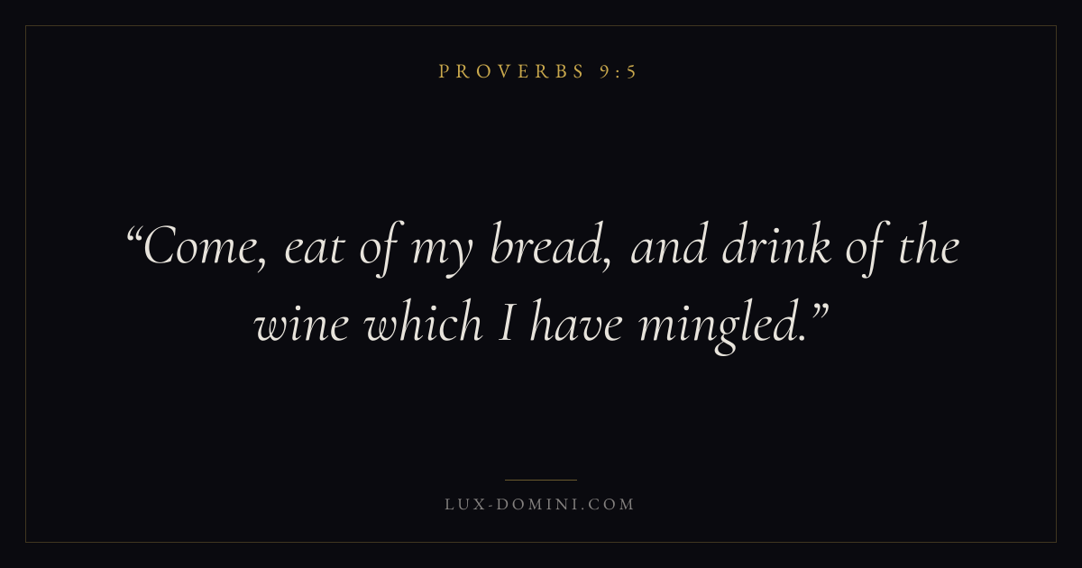 Books / Proverbs / Chapter 9 / Verse 5 ← Proverbs 9:4 Proverbs 9:5 Proverbs 9:6 → Come, eat of my bread, and drink of the wine which I have mingled. Download verse card Share on Twitter Share on Facebook Pin it ✦ Key themes FaithAnxiety and fearWisdomJustice and mercyFear of the Lord Read with Proverbs 9:3Proverbs 9:4Hebrews 11:1Romans 10:17 Related topics Bible verses about faithBible verses about anxiety and fearBible verses about wisdomBible verses about justice and mercy ✦ Proverbs Chapter 9 verses V. 1 V. 2 V. 3 V. 4 V. 5 V. 6 V. 7 V. 8 V. 9 V. 10 V. 11 V. 12 V. 13 V. 14 V. 15 V. 16 V. 17 V. 18