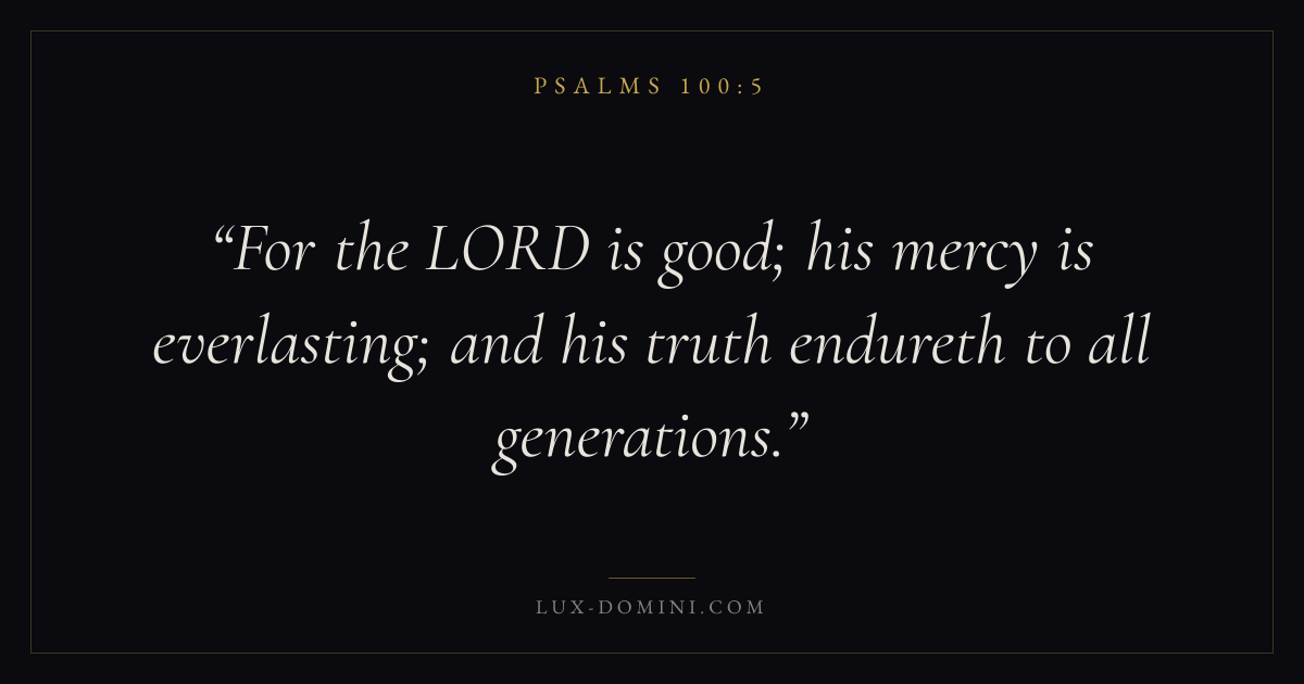 Books / Psalms / Chapter 100 / Verse 5 ← Psalms 100:4 Psalms 100:5 Psalms 101:1 → For the LORD is good; his mercy is everlasting; and his truth endureth to all generations. Download verse card Share on Twitter Share on Facebook Pin it ✦ Key themes FaithPrayerJustice and mercyTruthPraise Read with Hebrews 11:1Romans 10:17Matthew 6:9Luke 18:1 Related topics Bible verses about faithBible verses about prayerBible verses about justice and mercyBible verses about truthBible verses about thankfulness and gratitude ✦ Psalms Chapter 100 verses V. 1 V. 2 V. 3 V. 4 V. 5