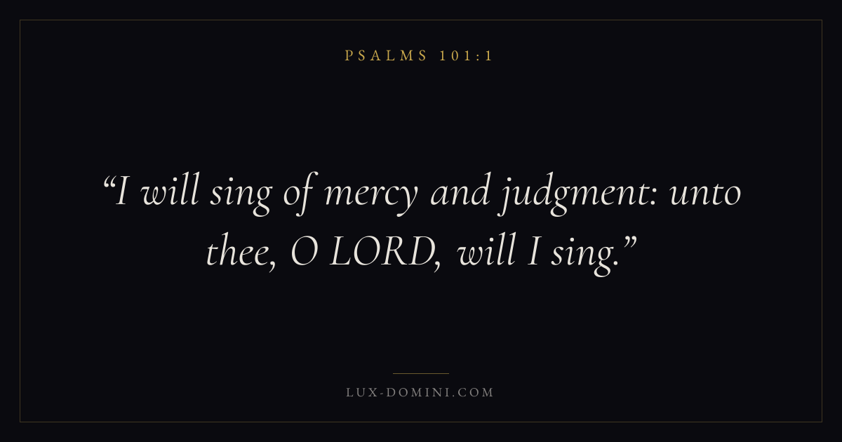 Books / Psalms / Chapter 101 / Verse 1 ← Psalms 100:5 Psalms 101:1 Psalms 101:2 → I will sing of mercy and judgment: unto thee, O LORD, will I sing. Download verse card Share on Twitter Share on Facebook Pin it ✦ Key themes FaithPrayerJustice and mercyPraise Read with Hebrews 11:1Romans 10:17Matthew 6:9Luke 18:1 Related topics Bible verses about faithBible verses about prayerBible verses about justice and mercyBible verses about thankfulness and gratitude ✦ Psalms Chapter 101 verses V. 1 V. 2 V. 3 V. 4 V. 5 V. 6 V. 7 V. 8