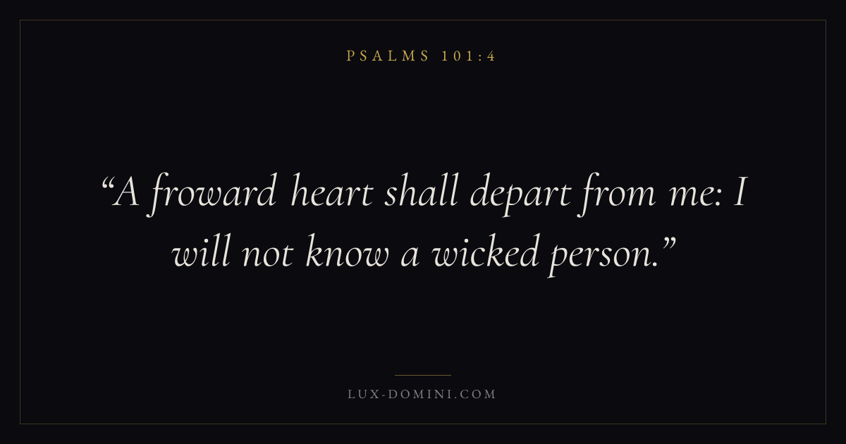 Books / Psalms / Chapter 101 / Verse 4 ← Psalms 101:3 Psalms 101:4 Psalms 101:5 → A froward heart shall depart from me: I will not know a wicked person. Download verse card Share on Twitter Share on Facebook Pin it ✦ Key themes FaithPrayerPraiseLament Read with Hebrews 11:1Romans 10:17Matthew 6:9Luke 18:1 Related topics Bible verses about faithBible verses about prayerBible verses about thankfulness and gratitudeBible verses about grief and loss ✦ Psalms Chapter 101 verses V. 1 V. 2 V. 3 V. 4 V. 5 V. 6 V. 7 V. 8