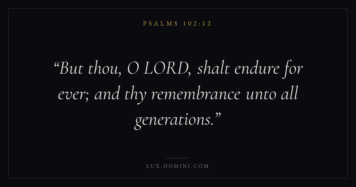 Books / Psalms / Chapter 102 / Verse 12 ← Psalms 102:11 Psalms 102:12 Psalms 102:13 → But thou, O LORD, shalt endure for ever; and thy remembrance unto all generations. Download verse card Share on Twitter Share on Facebook Pin it ✦ Key themes FaithPrayerPraiseLament Read with Hebrews 11:1Romans 10:17Matthew 6:9Luke 18:1 Related topics Bible verses about faithBible verses about prayerBible verses about thankfulness and gratitudeBible verses about grief and loss ✦ Psalms Chapter 102 verses V. 1 V. 2 V. 3 V. 4 V. 5 V. 6 V. 7 V. 8 V. 9 V. 10 V. 11 V. 12 V. 13 V. 14 V. 15 V. 16 V. 17 V. 18 V. 19 V. 20 V. 21 V. 22 V. 23 V. 24 V. 25 V. 26 V. 27 V. 28