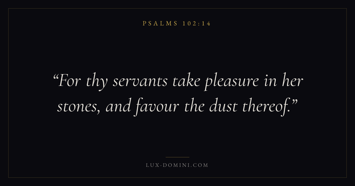 Books / Psalms / Chapter 102 / Verse 14 ← Psalms 102:13 Psalms 102:14 Psalms 102:15 → For thy servants take pleasure in her stones, and favour the dust thereof. Download verse card Share on Twitter Share on Facebook Pin it ✦ Key themes FaithPrayerPraiseLament Read with Hebrews 11:1Romans 10:17Matthew 6:9Luke 18:1 Related topics Bible verses about faithBible verses about prayerBible verses about thankfulness and gratitudeBible verses about grief and loss ✦ Psalms Chapter 102 verses V. 1 V. 2 V. 3 V. 4 V. 5 V. 6 V. 7 V. 8 V. 9 V. 10 V. 11 V. 12 V. 13 V. 14 V. 15 V. 16 V. 17 V. 18 V. 19 V. 20 V. 21 V. 22 V. 23 V. 24 V. 25 V. 26 V. 27 V. 28