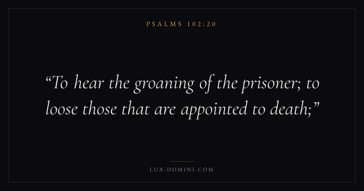 Books / Psalms / Chapter 102 / Verse 20 ← Psalms 102:19 Psalms 102:20 Psalms 102:21 → To hear the groaning of the prisoner; to loose those that are appointed to death; Download verse card Share on Twitter Share on Facebook Pin it ✦ Key themes FaithPrayerPraiseLament Read with Hebrews 11:1Romans 10:17Matthew 6:9Luke 18:1 Related topics Bible verses about faithBible verses about prayerBible verses about thankfulness and gratitudeBible verses about grief and loss ✦ Psalms Chapter 102 verses V. 1 V. 2 V. 3 V. 4 V. 5 V. 6 V. 7 V. 8 V. 9 V. 10 V. 11 V. 12 V. 13 V. 14 V. 15 V. 16 V. 17 V. 18 V. 19 V. 20 V. 21 V. 22 V. 23 V. 24 V. 25 V. 26 V. 27 V. 28