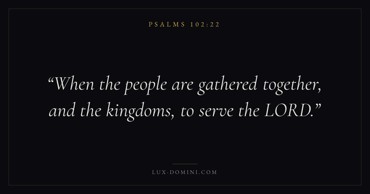 Books / Psalms / Chapter 102 / Verse 22 ← Psalms 102:21 Psalms 102:22 Psalms 102:23 → When the people are gathered together, and the kingdoms, to serve the LORD. Download verse card Share on Twitter Share on Facebook Pin it ✦ Key themes FaithPrayerPraiseLament Read with Hebrews 11:1Romans 10:17Matthew 6:9Luke 18:1 Related topics Bible verses about faithBible verses about prayerBible verses about thankfulness and gratitudeBible verses about grief and loss ✦ Psalms Chapter 102 verses V. 1 V. 2 V. 3 V. 4 V. 5 V. 6 V. 7 V. 8 V. 9 V. 10 V. 11 V. 12 V. 13 V. 14 V. 15 V. 16 V. 17 V. 18 V. 19 V. 20 V. 21 V. 22 V. 23 V. 24 V. 25 V. 26 V. 27 V. 28