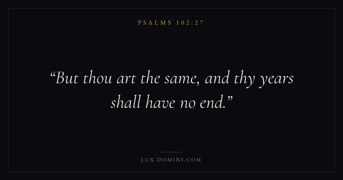 Books / Psalms / Chapter 102 / Verse 27 ← Psalms 102:26 Psalms 102:27 Psalms 102:28 → But thou art the same, and thy years shall have no end. Download verse card Share on Twitter Share on Facebook Pin it ✦ Key themes FaithPrayerPraiseLament Read with Hebrews 11:1Romans 10:17Matthew 6:9Luke 18:1 Related topics Bible verses about faithBible verses about prayerBible verses about thankfulness and gratitudeBible verses about grief and loss ✦ Psalms Chapter 102 verses V. 1 V. 2 V. 3 V. 4 V. 5 V. 6 V. 7 V. 8 V. 9 V. 10 V. 11 V. 12 V. 13 V. 14 V. 15 V. 16 V. 17 V. 18 V. 19 V. 20 V. 21 V. 22 V. 23 V. 24 V. 25 V. 26 V. 27 V. 28