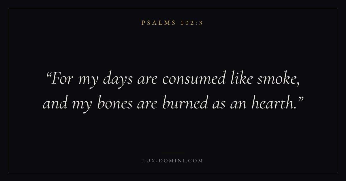 Books / Psalms / Chapter 102 / Verse 3 ← Psalms 102:2 Psalms 102:3 Psalms 102:4 → For my days are consumed like smoke, and my bones are burned as an hearth. Download verse card Share on Twitter Share on Facebook Pin it ✦ Key themes FaithSuffering and trialsPrayerTruthPraise Read with Hebrews 11:1Romans 10:17Romans 8:182 Corinthians 4:17 Related topics Bible verses about faithBible verses about suffering and trialsBible verses about prayerBible verses about truthBible verses about thankfulness and gratitude ✦ Psalms Chapter 102 verses V. 1 V. 2 V. 3 V. 4 V. 5 V. 6 V. 7 V. 8 V. 9 V. 10 V. 11 V. 12 V. 13 V. 14 V. 15 V. 16 V. 17 V. 18 V. 19 V. 20 V. 21 V. 22 V. 23 V. 24 V. 25 V. 26 V. 27 V. 28