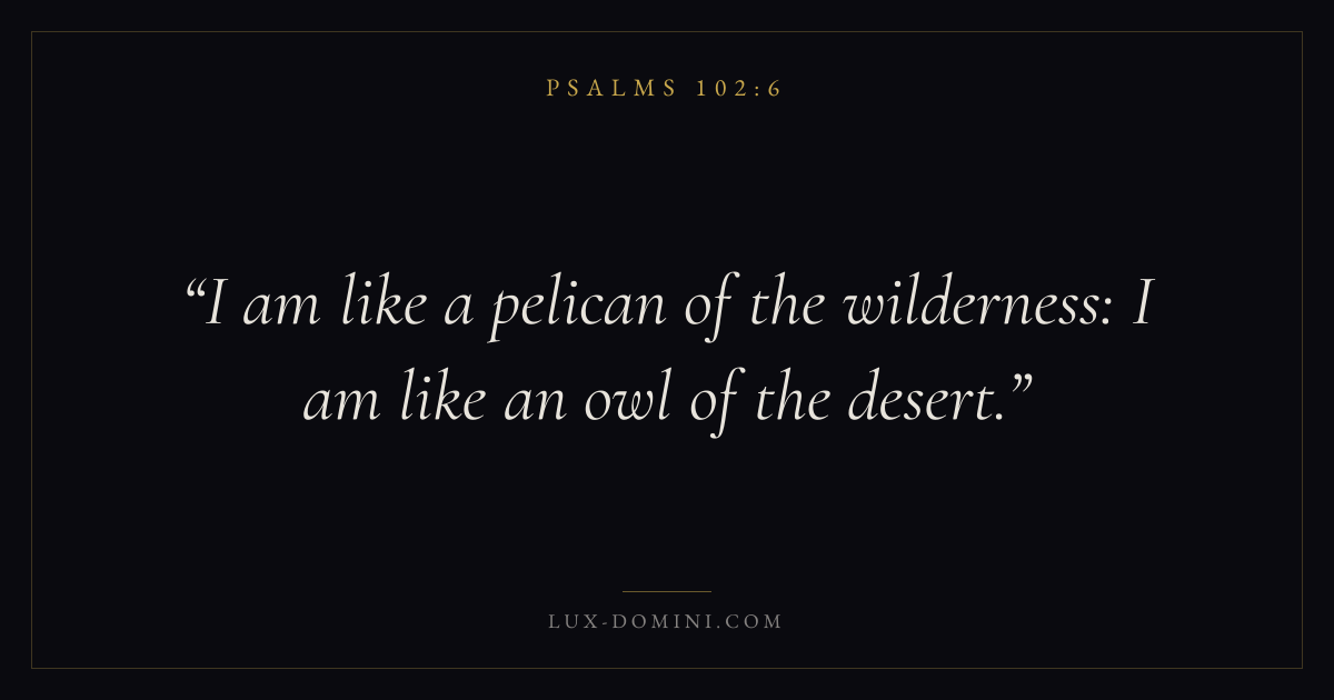 Books / Psalms / Chapter 102 / Verse 6 ← Psalms 102:5 Psalms 102:6 Psalms 102:7 → I am like a pelican of the wilderness: I am like an owl of the desert. Download verse card Share on Twitter Share on Facebook Pin it ✦ Key themes FaithSuffering and trialsPrayerTruthPraise Read with Hebrews 11:1Romans 10:17Romans 8:182 Corinthians 4:17 Related topics Bible verses about faithBible verses about suffering and trialsBible verses about prayerBible verses about truthBible verses about thankfulness and gratitude ✦ Psalms Chapter 102 verses V. 1 V. 2 V. 3 V. 4 V. 5 V. 6 V. 7 V. 8 V. 9 V. 10 V. 11 V. 12 V. 13 V. 14 V. 15 V. 16 V. 17 V. 18 V. 19 V. 20 V. 21 V. 22 V. 23 V. 24 V. 25 V. 26 V. 27 V. 28