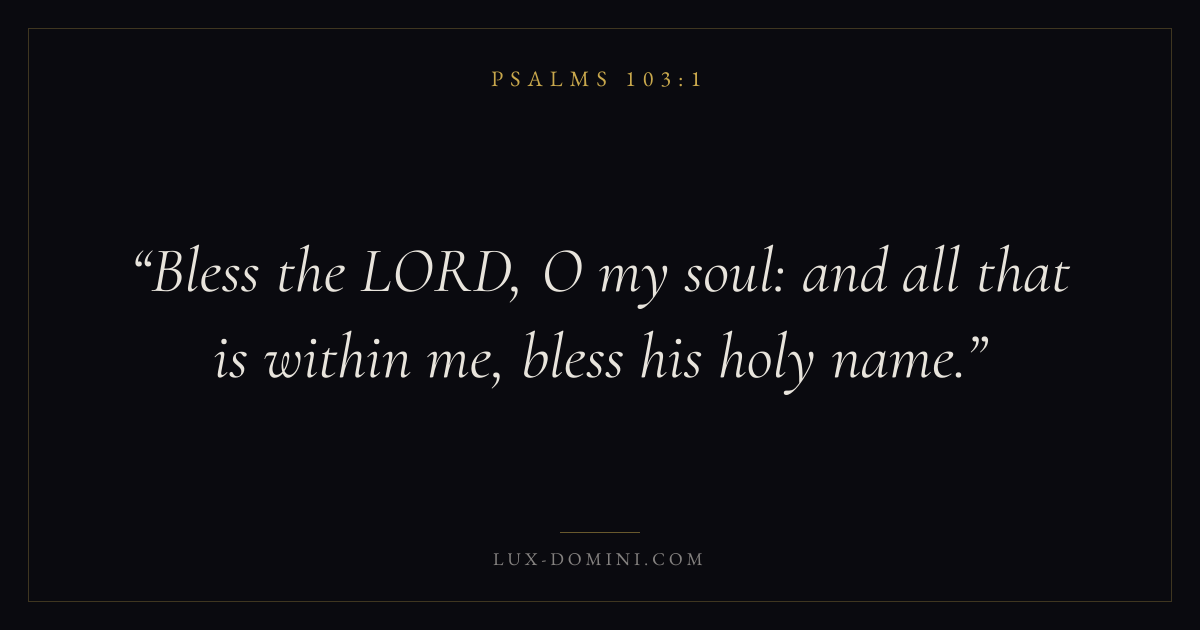 Bless the Lord, O my soul - The word "bless," as applied to God, means to praise, implying always a strong affection for him as well as a sense of gratitude. As used with reference to people, the word implies a "wish" that they may be blessed or happy, accompanied often with a prayer that they may be so. Such is the purport of the "blessing" addressed to a congregation of worshippers. Compare Numbers 6:23-27 . The word "soul" here is equivalent to mind or heart: my mental and moral powers, as capable of understanding and appreciating his favors.