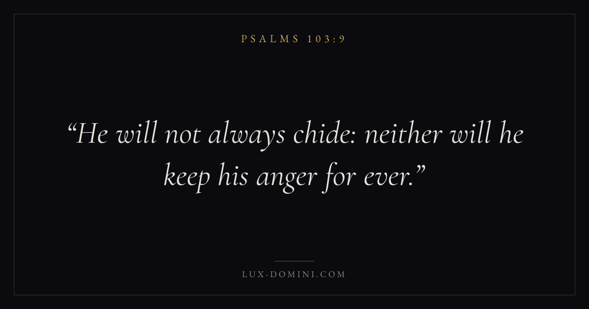 Books / Psalms / Chapter 103 / Verse 9 ← Psalms 103:8 Psalms 103:9 Psalms 103:10 → He will not always chide: neither will he keep his anger for ever. Download verse card Share on Twitter Share on Facebook Pin it ✦ Key themes FaithPrayerGracePraise Read with Hebrews 11:1Romans 10:17Matthew 6:9Luke 18:1 Related topics Bible verses about faithBible verses about prayerBible verses about graceBible verses about thankfulness and gratitude ✦ Psalms Chapter 103 verses V. 1 V. 2 V. 3 V. 4 V. 5 V. 6 V. 7 V. 8 V. 9 V. 10 V. 11 V. 12 V. 13 V. 14 V. 15 V. 16 V. 17 V. 18 V. 19 V. 20 V. 21 V. 22