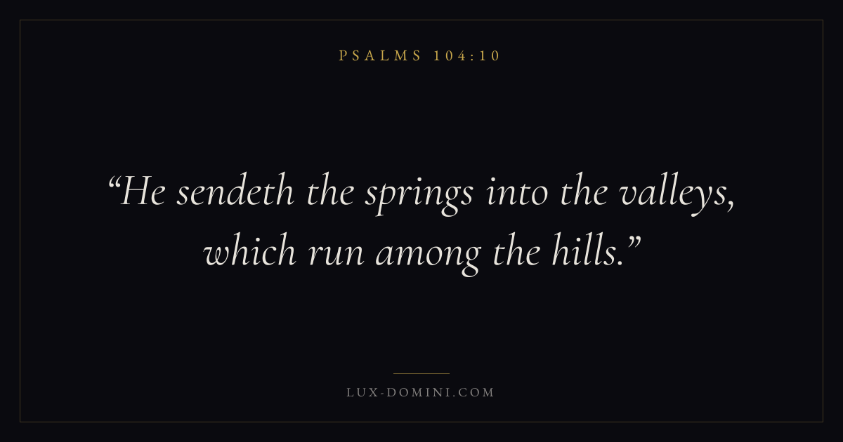 Books / Psalms / Chapter 104 / Verse 10 ← Psalms 104:9 Psalms 104:10 Psalms 104:11 → He sendeth the springs into the valleys, which run among the hills. Download verse card Share on Twitter Share on Facebook Pin it ✦ Key themes FaithPrayerPraiseLament Read with Hebrews 11:1Romans 10:17Matthew 6:9Luke 18:1 Related topics Bible verses about faithBible verses about prayerBible verses about thankfulness and gratitudeBible verses about grief and loss ✦ Psalms Chapter 104 verses V. 1 V. 2 V. 3 V. 4 V. 5 V. 6 V. 7 V. 8 V. 9 V. 10 V. 11 V. 12 V. 13 V. 14 V. 15 V. 16 V. 17 V. 18 V. 19 V. 20 V. 21 V. 22 V. 23 V. 24 V. 25 V. 26 V. 27 V. 28 V. 29 V. 30 V. 31 V. 32 V. 33 V. 34 V. 35
