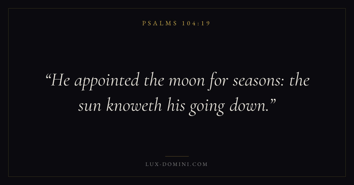 Books / Psalms / Chapter 104 / Verse 19 ← Psalms 104:18 Psalms 104:19 Psalms 104:20 → He appointed the moon for seasons: the sun knoweth his going down. Download verse card Share on Twitter Share on Facebook Pin it ✦ Key themes FaithHopePrayerPraise Read with Hebrews 11:1Romans 10:17Romans 8:24Revelation 21:4 Related topics Bible verses about faithBible verses about hopeBible verses about prayerBible verses about thankfulness and gratitude ✦ Psalms Chapter 104 verses V. 1 V. 2 V. 3 V. 4 V. 5 V. 6 V. 7 V. 8 V. 9 V. 10 V. 11 V. 12 V. 13 V. 14 V. 15 V. 16 V. 17 V. 18 V. 19 V. 20 V. 21 V. 22 V. 23 V. 24 V. 25 V. 26 V. 27 V. 28 V. 29 V. 30 V. 31 V. 32 V. 33 V. 34 V. 35
