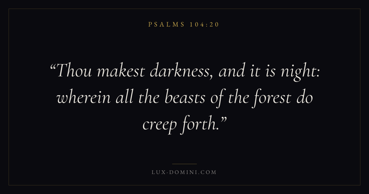 Books / Psalms / Chapter 104 / Verse 20 ← Psalms 104:19 Psalms 104:20 Psalms 104:21 → Thou makest darkness, and it is night: wherein all the beasts of the forest do creep forth. Download verse card Share on Twitter Share on Facebook Pin it ✦ Key themes FaithHopePrayerPraise Read with Hebrews 11:1Romans 10:17Romans 8:24Revelation 21:4 Related topics Bible verses about faithBible verses about hopeBible verses about prayerBible verses about thankfulness and gratitude ✦ Psalms Chapter 104 verses V. 1 V. 2 V. 3 V. 4 V. 5 V. 6 V. 7 V. 8 V. 9 V. 10 V. 11 V. 12 V. 13 V. 14 V. 15 V. 16 V. 17 V. 18 V. 19 V. 20 V. 21 V. 22 V. 23 V. 24 V. 25 V. 26 V. 27 V. 28 V. 29 V. 30 V. 31 V. 32 V. 33 V. 34 V. 35