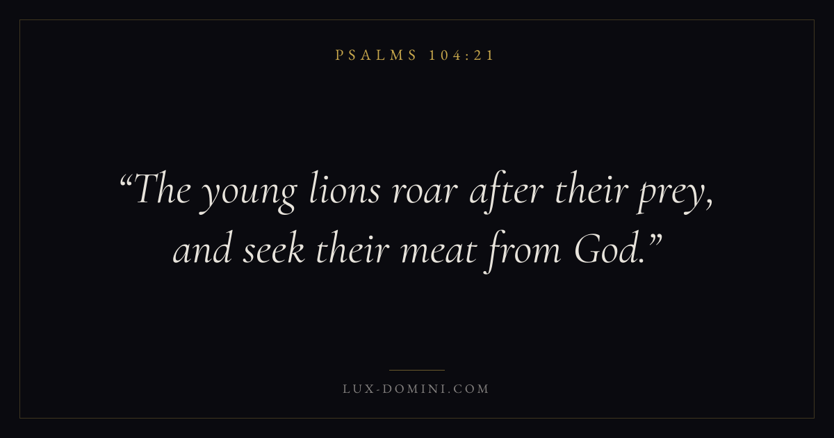 Books / Psalms / Chapter 104 / Verse 21 ← Psalms 104:20 Psalms 104:21 Psalms 104:22 → The young lions roar after their prey, and seek their meat from God. Download verse card Share on Twitter Share on Facebook Pin it ✦ Key themes FaithHopePrayerPraise Read with Hebrews 11:1Romans 10:17Romans 8:24Revelation 21:4 Related topics Bible verses about faithBible verses about hopeBible verses about prayerBible verses about thankfulness and gratitude ✦ Psalms Chapter 104 verses V. 1 V. 2 V. 3 V. 4 V. 5 V. 6 V. 7 V. 8 V. 9 V. 10 V. 11 V. 12 V. 13 V. 14 V. 15 V. 16 V. 17 V. 18 V. 19 V. 20 V. 21 V. 22 V. 23 V. 24 V. 25 V. 26 V. 27 V. 28 V. 29 V. 30 V. 31 V. 32 V. 33 V. 34 V. 35