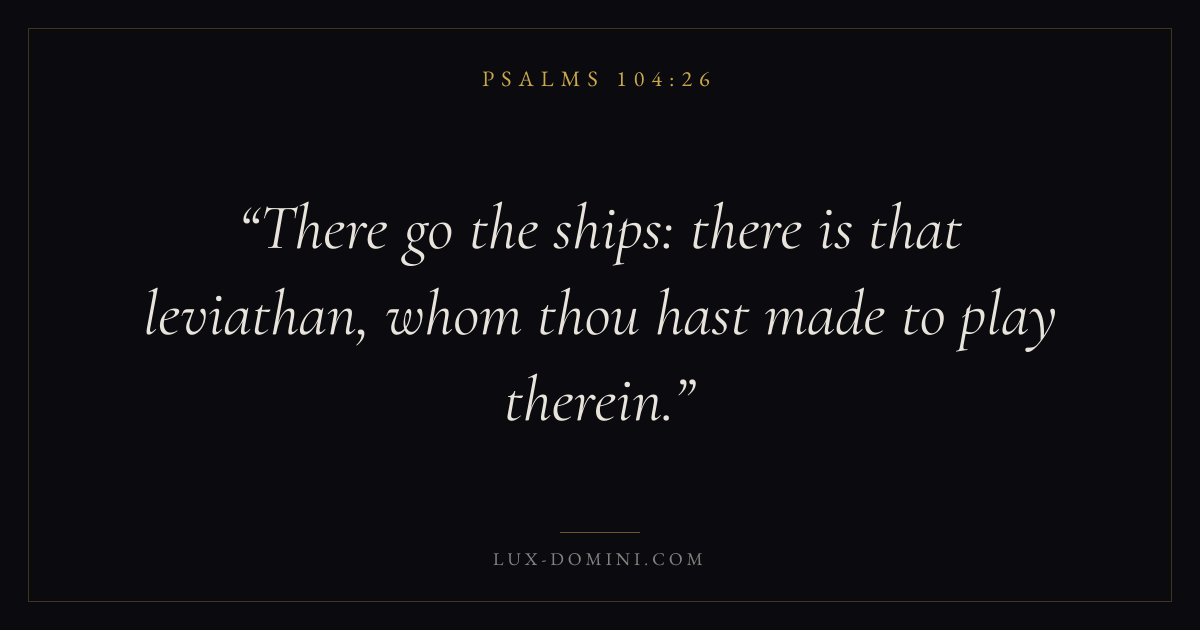 Books / Psalms / Chapter 104 / Verse 26 ← Psalms 104:25 Psalms 104:26 Psalms 104:27 → There go the ships: there is that leviathan, whom thou hast made to play therein. Download verse card Share on Twitter Share on Facebook Pin it ✦ Key themes FaithHopePrayerPraise Read with Hebrews 11:1Romans 10:17Romans 8:24Revelation 21:4 Related topics Bible verses about faithBible verses about hopeBible verses about prayerBible verses about thankfulness and gratitude ✦ Psalms Chapter 104 verses V. 1 V. 2 V. 3 V. 4 V. 5 V. 6 V. 7 V. 8 V. 9 V. 10 V. 11 V. 12 V. 13 V. 14 V. 15 V. 16 V. 17 V. 18 V. 19 V. 20 V. 21 V. 22 V. 23 V. 24 V. 25 V. 26 V. 27 V. 28 V. 29 V. 30 V. 31 V. 32 V. 33 V. 34 V. 35