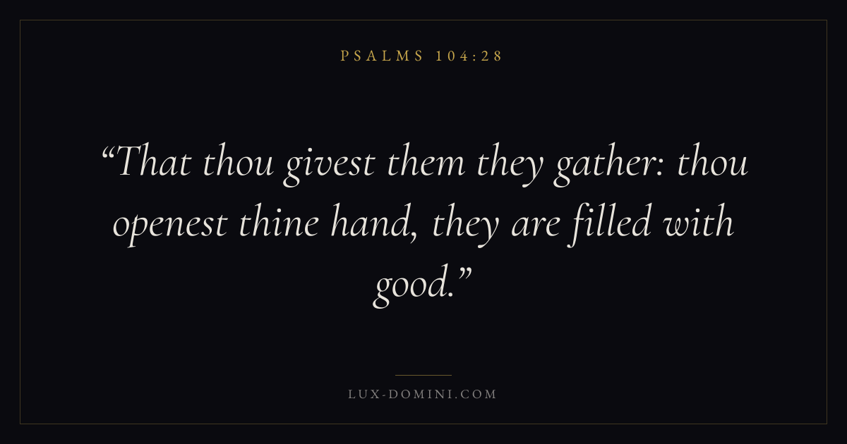 Books / Psalms / Chapter 104 / Verse 28 ← Psalms 104:27 Psalms 104:28 Psalms 104:29 → That thou givest them they gather: thou openest thine hand, they are filled with good. Download verse card Share on Twitter Share on Facebook Pin it ✦ Key themes FaithHopePrayerPraise Read with Hebrews 11:1Romans 10:17Romans 8:24Revelation 21:4 Related topics Bible verses about faithBible verses about hopeBible verses about prayerBible verses about thankfulness and gratitude ✦ Psalms Chapter 104 verses V. 1 V. 2 V. 3 V. 4 V. 5 V. 6 V. 7 V. 8 V. 9 V. 10 V. 11 V. 12 V. 13 V. 14 V. 15 V. 16 V. 17 V. 18 V. 19 V. 20 V. 21 V. 22 V. 23 V. 24 V. 25 V. 26 V. 27 V. 28 V. 29 V. 30 V. 31 V. 32 V. 33 V. 34 V. 35