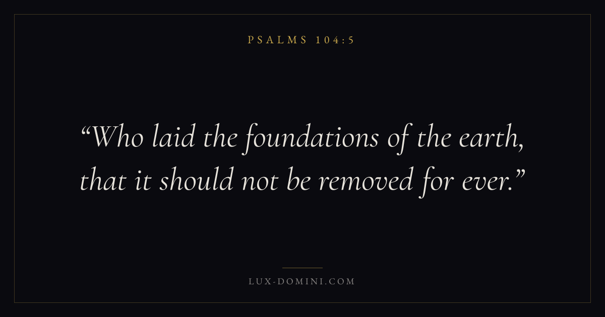 Books / Psalms / Chapter 104 / Verse 5 ← Psalms 104:4 Psalms 104:5 Psalms 104:6 → Who laid the foundations of the earth, that it should not be removed for ever. Download verse card Share on Twitter Share on Facebook Pin it ✦ Key themes FaithPrayerPraiseLament Read with Hebrews 11:1Romans 10:17Matthew 6:9Luke 18:1 Related topics Bible verses about faithBible verses about prayerBible verses about thankfulness and gratitudeBible verses about grief and loss ✦ Psalms Chapter 104 verses V. 1 V. 2 V. 3 V. 4 V. 5 V. 6 V. 7 V. 8 V. 9 V. 10 V. 11 V. 12 V. 13 V. 14 V. 15 V. 16 V. 17 V. 18 V. 19 V. 20 V. 21 V. 22 V. 23 V. 24 V. 25 V. 26 V. 27 V. 28 V. 29 V. 30 V. 31 V. 32 V. 33 V. 34 V. 35