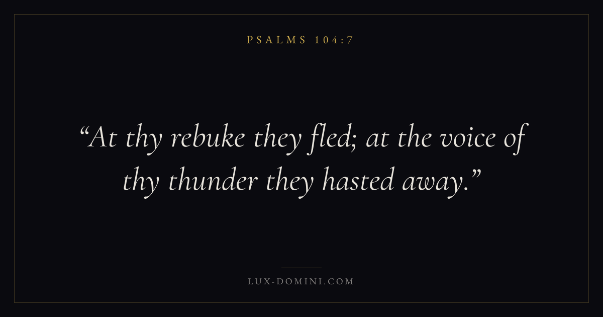 Books / Psalms / Chapter 104 / Verse 7 ← Psalms 104:6 Psalms 104:7 Psalms 104:8 → At thy rebuke they fled; at the voice of thy thunder they hasted away. Download verse card Share on Twitter Share on Facebook Pin it ✦ Key themes FaithPrayerPraiseLament Read with Hebrews 11:1Romans 10:17Matthew 6:9Luke 18:1 Related topics Bible verses about faithBible verses about prayerBible verses about thankfulness and gratitudeBible verses about grief and loss ✦ Psalms Chapter 104 verses V. 1 V. 2 V. 3 V. 4 V. 5 V. 6 V. 7 V. 8 V. 9 V. 10 V. 11 V. 12 V. 13 V. 14 V. 15 V. 16 V. 17 V. 18 V. 19 V. 20 V. 21 V. 22 V. 23 V. 24 V. 25 V. 26 V. 27 V. 28 V. 29 V. 30 V. 31 V. 32 V. 33 V. 34 V. 35