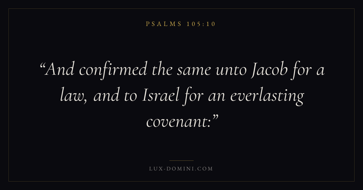 Books / Psalms / Chapter 105 / Verse 10 ← Psalms 105:9 Psalms 105:10 Psalms 105:11 → And confirmed the same unto Jacob for a law, and to Israel for an everlasting covenant: Download verse card Share on Twitter Share on Facebook Pin it ✦ Key themes FaithPrayerTruthPraise Read with Hebrews 11:1Romans 10:17Matthew 6:9Luke 18:1 Related topics Bible verses about faithBible verses about prayerBible verses about truthBible verses about thankfulness and gratitude ✦ Psalms Chapter 105 verses V. 1 V. 2 V. 3 V. 4 V. 5 V. 6 V. 7 V. 8 V. 9 V. 10 V. 11 V. 12 V. 13 V. 14 V. 15 V. 16 V. 17 V. 18 V. 19 V. 20 V. 21 V. 22 V. 23 V. 24 V. 25 V. 26 V. 27 V. 28 V. 29 V. 30 V. 31 V. 32 V. 33 V. 34 V. 35 V. 36 V. 37 V. 38 V. 39 V. 40 V. 41 V. 42 V. 43 V. 44 V. 45