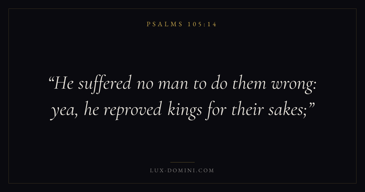 Books / Psalms / Chapter 105 / Verse 14 ← Psalms 105:13 Psalms 105:14 Psalms 105:15 → He suffered no man to do them wrong: yea, he reproved kings for their sakes; Download verse card Share on Twitter Share on Facebook Pin it ✦ Key themes FaithPrayerTruthPraise Read with Hebrews 11:1Romans 10:17Matthew 6:9Luke 18:1 Related topics Bible verses about faithBible verses about prayerBible verses about truthBible verses about thankfulness and gratitude ✦ Psalms Chapter 105 verses V. 1 V. 2 V. 3 V. 4 V. 5 V. 6 V. 7 V. 8 V. 9 V. 10 V. 11 V. 12 V. 13 V. 14 V. 15 V. 16 V. 17 V. 18 V. 19 V. 20 V. 21 V. 22 V. 23 V. 24 V. 25 V. 26 V. 27 V. 28 V. 29 V. 30 V. 31 V. 32 V. 33 V. 34 V. 35 V. 36 V. 37 V. 38 V. 39 V. 40 V. 41 V. 42 V. 43 V. 44 V. 45