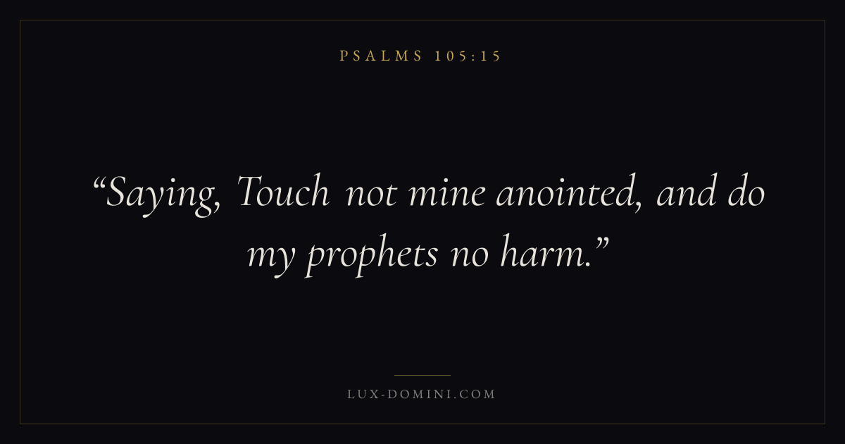 Books / Psalms / Chapter 105 / Verse 15 ← Psalms 105:14 Psalms 105:15 Psalms 105:16 → Saying, Touch not mine anointed, and do my prophets no harm. Download verse card Share on Twitter Share on Facebook Pin it ✦ Key themes FaithPrayerTruthPraise Read with Hebrews 11:1Romans 10:17Matthew 6:9Luke 18:1 Related topics Bible verses about faithBible verses about prayerBible verses about truthBible verses about thankfulness and gratitude ✦ Psalms Chapter 105 verses V. 1 V. 2 V. 3 V. 4 V. 5 V. 6 V. 7 V. 8 V. 9 V. 10 V. 11 V. 12 V. 13 V. 14 V. 15 V. 16 V. 17 V. 18 V. 19 V. 20 V. 21 V. 22 V. 23 V. 24 V. 25 V. 26 V. 27 V. 28 V. 29 V. 30 V. 31 V. 32 V. 33 V. 34 V. 35 V. 36 V. 37 V. 38 V. 39 V. 40 V. 41 V. 42 V. 43 V. 44 V. 45