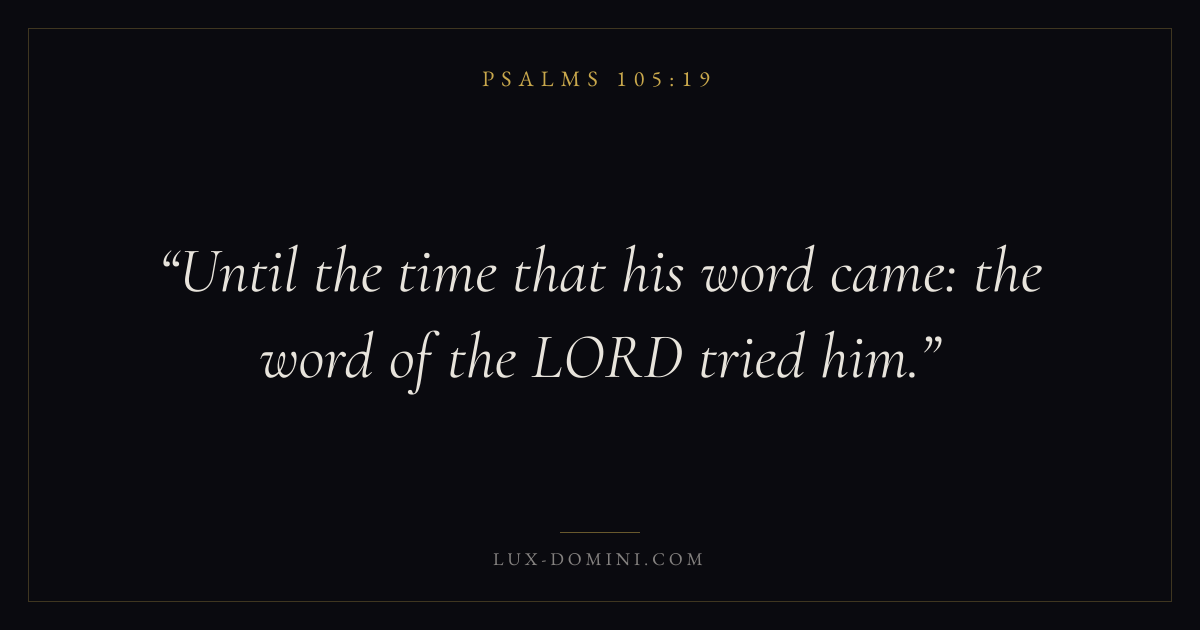 Books / Psalms / Chapter 105 / Verse 19 ← Psalms 105:18 Psalms 105:19 Psalms 105:20 → Until the time that his word came: the word of the LORD tried him. Download verse card Share on Twitter Share on Facebook Pin it ✦ Key themes FaithPrayerTruthPraise Read with Hebrews 11:1Romans 10:17Matthew 6:9Luke 18:1 Related topics Bible verses about faithBible verses about prayerBible verses about truthBible verses about thankfulness and gratitude ✦ Psalms Chapter 105 verses V. 1 V. 2 V. 3 V. 4 V. 5 V. 6 V. 7 V. 8 V. 9 V. 10 V. 11 V. 12 V. 13 V. 14 V. 15 V. 16 V. 17 V. 18 V. 19 V. 20 V. 21 V. 22 V. 23 V. 24 V. 25 V. 26 V. 27 V. 28 V. 29 V. 30 V. 31 V. 32 V. 33 V. 34 V. 35 V. 36 V. 37 V. 38 V. 39 V. 40 V. 41 V. 42 V. 43 V. 44 V. 45