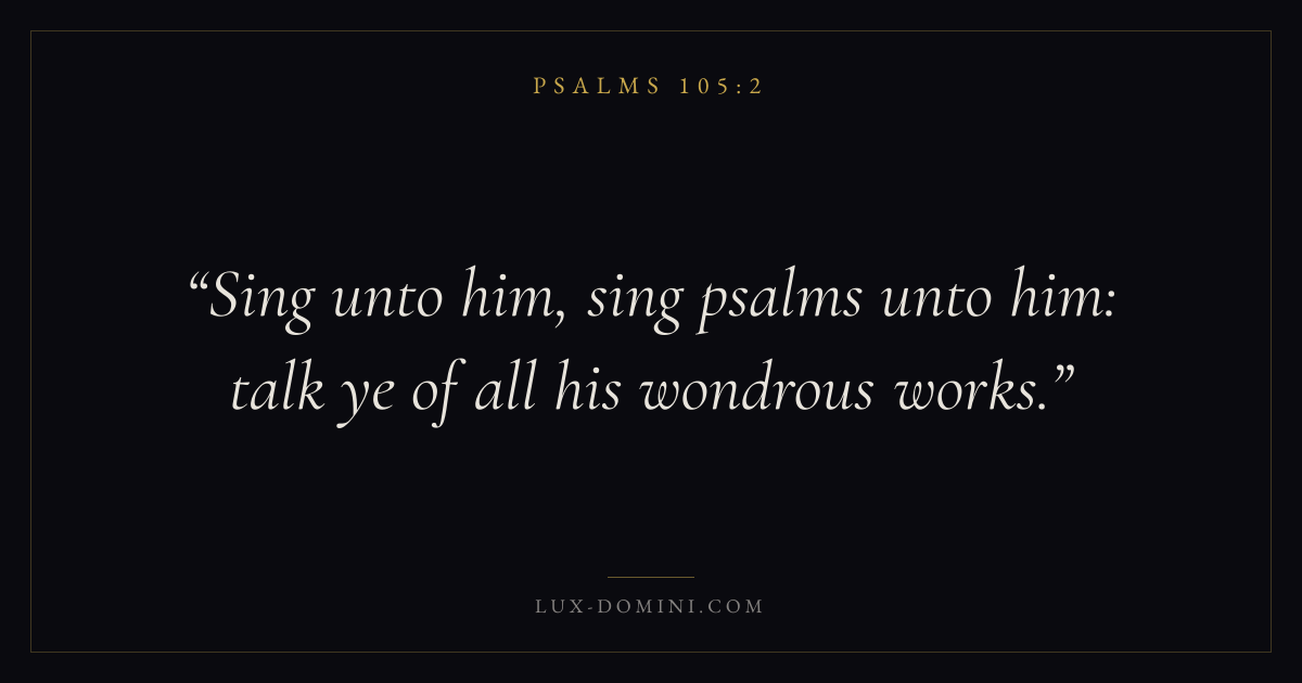 Books / Psalms / Chapter 105 / Verse 2 ← Psalms 105:1 Psalms 105:2 Psalms 105:3 → Sing unto him, sing psalms unto him: talk ye of all his wondrous works. Download verse card Share on Twitter Share on Facebook Pin it ✦ Key themes FaithPrayerGracePraise Read with Hebrews 11:1Romans 10:17Matthew 6:9Luke 18:1 Related topics Bible verses about faithBible verses about prayerBible verses about graceBible verses about thankfulness and gratitude ✦ Psalms Chapter 105 verses V. 1 V. 2 V. 3 V. 4 V. 5 V. 6 V. 7 V. 8 V. 9 V. 10 V. 11 V. 12 V. 13 V. 14 V. 15 V. 16 V. 17 V. 18 V. 19 V. 20 V. 21 V. 22 V. 23 V. 24 V. 25 V. 26 V. 27 V. 28 V. 29 V. 30 V. 31 V. 32 V. 33 V. 34 V. 35 V. 36 V. 37 V. 38 V. 39 V. 40 V. 41 V. 42 V. 43 V. 44 V. 45