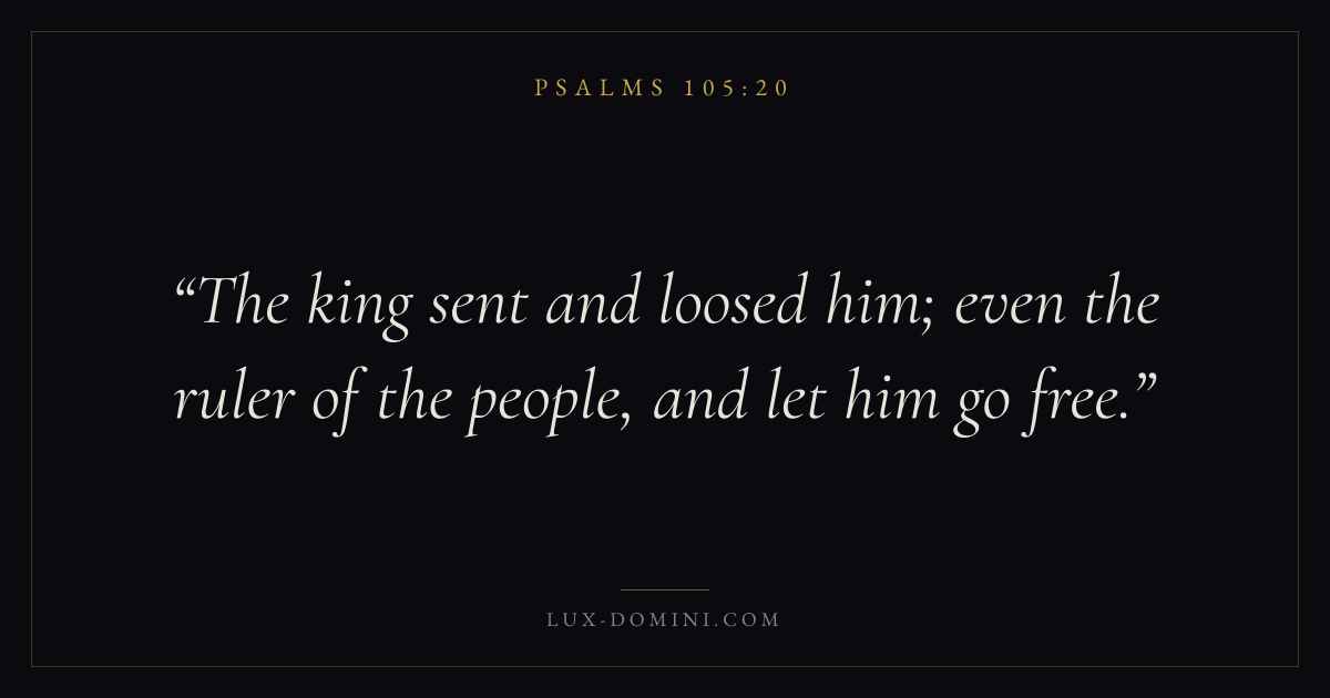 Books / Psalms / Chapter 105 / Verse 20 ← Psalms 105:19 Psalms 105:20 Psalms 105:21 → The king sent and loosed him; even the ruler of the people, and let him go free. Download verse card Share on Twitter Share on Facebook Pin it ✦ Key themes FaithPrayerTruthPraise Read with Hebrews 11:1Romans 10:17Matthew 6:9Luke 18:1 Related topics Bible verses about faithBible verses about prayerBible verses about truthBible verses about thankfulness and gratitude ✦ Psalms Chapter 105 verses V. 1 V. 2 V. 3 V. 4 V. 5 V. 6 V. 7 V. 8 V. 9 V. 10 V. 11 V. 12 V. 13 V. 14 V. 15 V. 16 V. 17 V. 18 V. 19 V. 20 V. 21 V. 22 V. 23 V. 24 V. 25 V. 26 V. 27 V. 28 V. 29 V. 30 V. 31 V. 32 V. 33 V. 34 V. 35 V. 36 V. 37 V. 38 V. 39 V. 40 V. 41 V. 42 V. 43 V. 44 V. 45