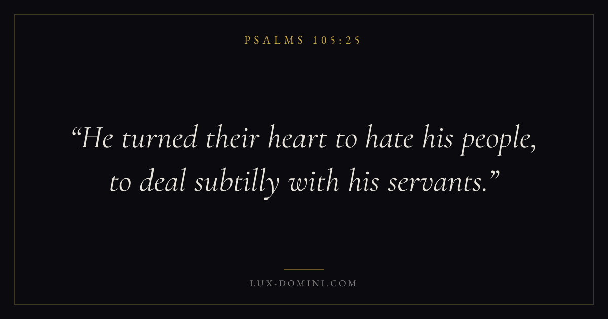 Books / Psalms / Chapter 105 / Verse 25 ← Psalms 105:24 Psalms 105:25 Psalms 105:26 → He turned their heart to hate his people, to deal subtilly with his servants. Download verse card Share on Twitter Share on Facebook Pin it ✦ Key themes FaithPrayerSalvationTruthPraise Read with Hebrews 11:1Romans 10:17Matthew 6:9Luke 18:1 Related topics Bible verses about faithBible verses about prayerBible verses about salvationBible verses about truthBible verses about thankfulness and gratitude ✦ Psalms Chapter 105 verses V. 1 V. 2 V. 3 V. 4 V. 5 V. 6 V. 7 V. 8 V. 9 V. 10 V. 11 V. 12 V. 13 V. 14 V. 15 V. 16 V. 17 V. 18 V. 19 V. 20 V. 21 V. 22 V. 23 V. 24 V. 25 V. 26 V. 27 V. 28 V. 29 V. 30 V. 31 V. 32 V. 33 V. 34 V. 35 V. 36 V. 37 V. 38 V. 39 V. 40 V. 41 V. 42 V. 43 V. 44 V. 45