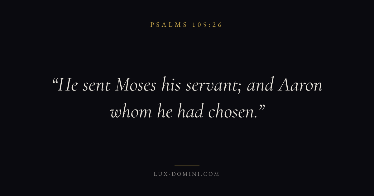 Books / Psalms / Chapter 105 / Verse 26 ← Psalms 105:25 Psalms 105:26 Psalms 105:27 → He sent Moses his servant; and Aaron whom he had chosen. Download verse card Share on Twitter Share on Facebook Pin it ✦ Key themes FaithPrayerSalvationTruthPraise Read with Hebrews 11:1Romans 10:17Matthew 6:9Luke 18:1 Related topics Bible verses about faithBible verses about prayerBible verses about salvationBible verses about truthBible verses about thankfulness and gratitude ✦ Psalms Chapter 105 verses V. 1 V. 2 V. 3 V. 4 V. 5 V. 6 V. 7 V. 8 V. 9 V. 10 V. 11 V. 12 V. 13 V. 14 V. 15 V. 16 V. 17 V. 18 V. 19 V. 20 V. 21 V. 22 V. 23 V. 24 V. 25 V. 26 V. 27 V. 28 V. 29 V. 30 V. 31 V. 32 V. 33 V. 34 V. 35 V. 36 V. 37 V. 38 V. 39 V. 40 V. 41 V. 42 V. 43 V. 44 V. 45